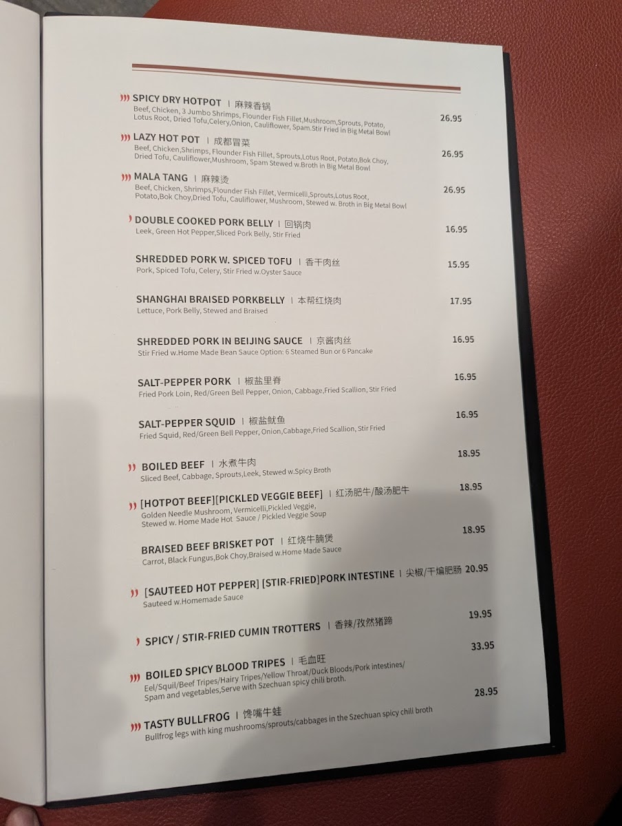 The menu features a range of choices from hot pots and spicy peppercorn chicken to delicate steamed soup dumplings and crispy walnut shrimp. These selections pair naturally with the warm, inviting atmosphere—perfect for gathering around large tables where food can be shared and enjoyed together.
